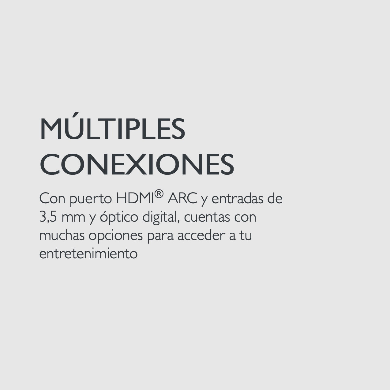 Múltiples entradas (HDMI-ARC, óptico digital, auxiliar 3.5 mm): permite conectar variedad de dispositivos como TV, consola, reproductores o dispositivos móviles de forma fácil.