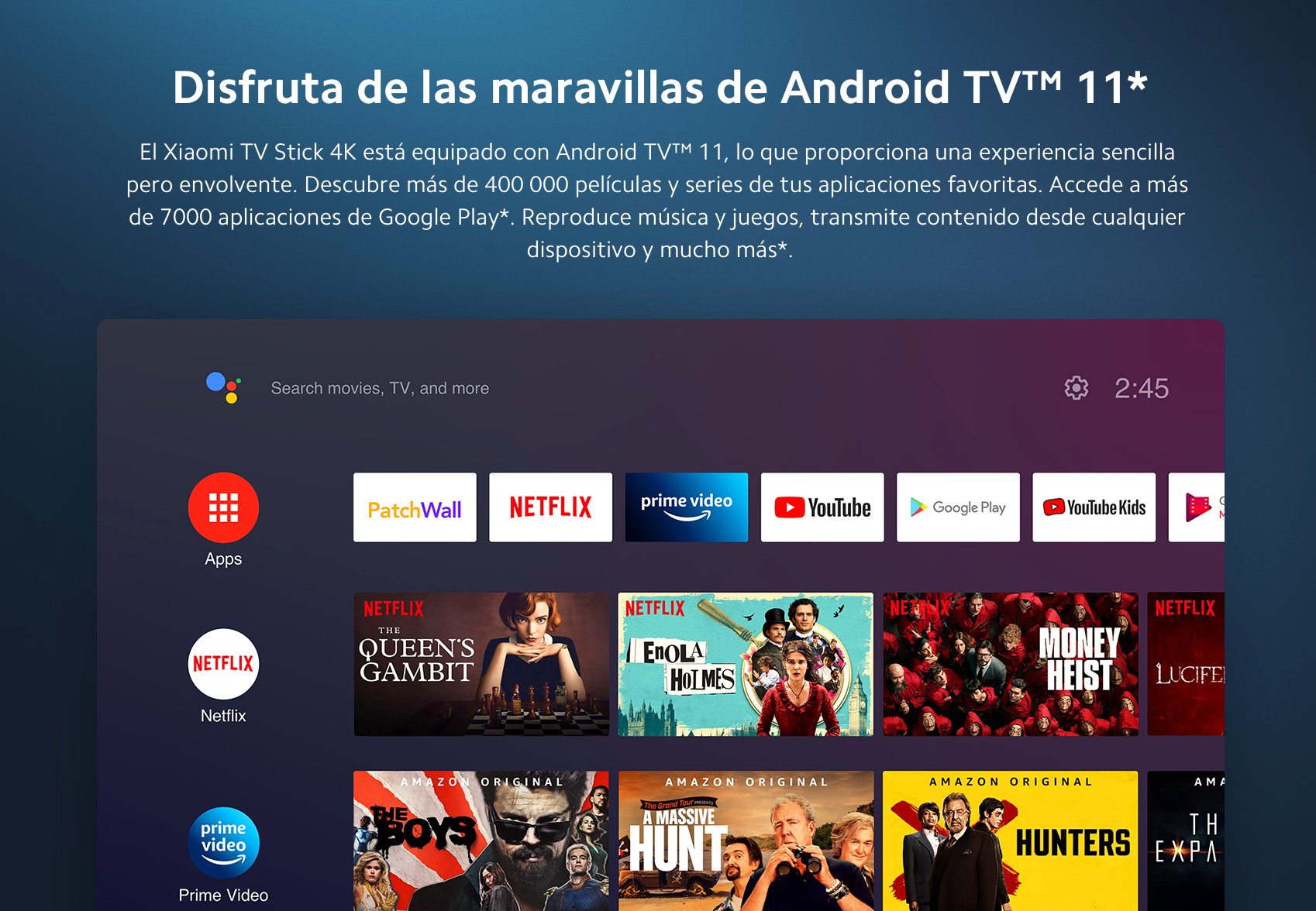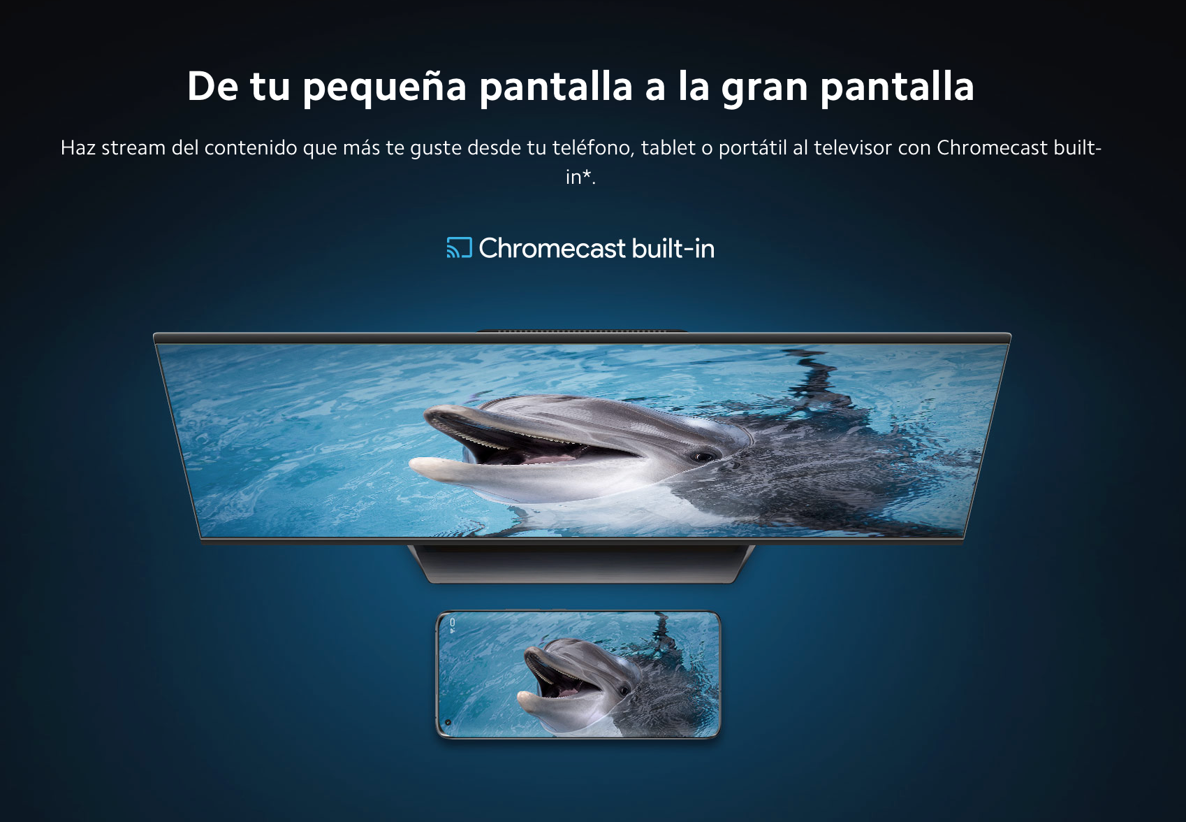 Incluye Android TV 11 con más de 400 000 títulos disponibles, acceso a Google Play y control por voz con Google Assistant. También cuenta con Chromecast incorporado.